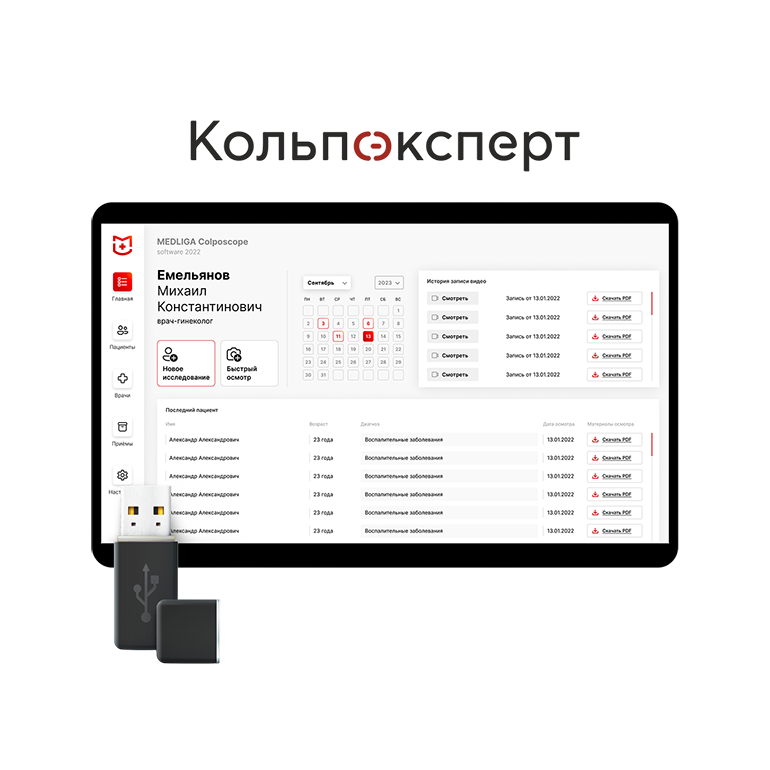 Интеграция с ПО «Кольпоэксперт» даёт возможность вести реестр осмотров, протоколы, фото и видеодокументацию, а также просматривать динамику состояний в рамках диспансерного наблюдения. Сбор анамнеза до кольпоскопии по стандартам ASCCP. Заключение по классификации Рио-де-Жанейро. Интеграция с медицинскими информационными системами (МИС).