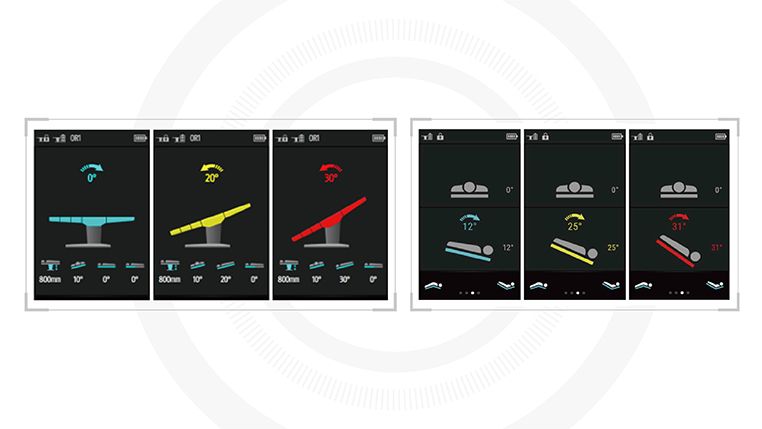 Во время регулировки положения на экране появляется индикатор с цветовой кодировкой, показывающий угол наклона. Также система выдает предупреждение, о чрезмерном положении Тренделенбурга и обратном положении Тренделенбурга.