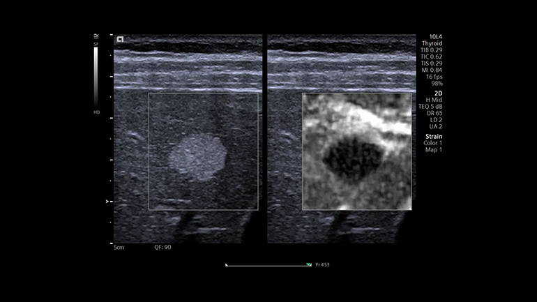 Технология визуализации эластичности ткани с использованием мануальной компрессии для линейных датчиков. Метод мануальной деформационной эластографии Virtual Touch обеспечивает простое и качественное измерение жесткости пораженного участка относительно окружающих неповрежденных тканей.