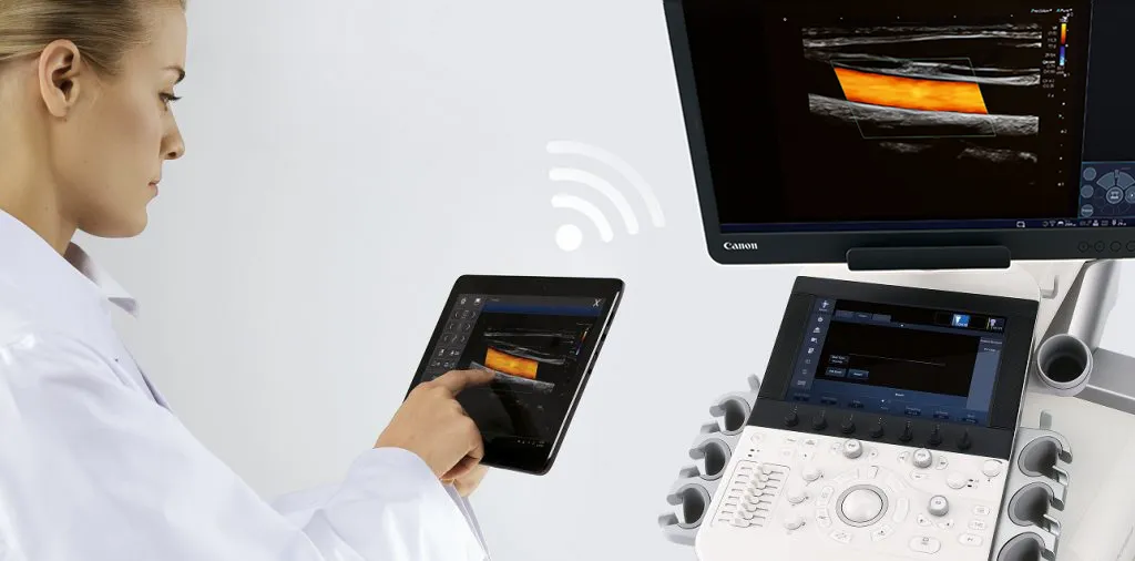 Aplio i-series позволяет удаленно управлять системой с беспроводного планшета. Это особенно полезно во время MSK и сосудистых обследований, когда бывает трудно одновременно сканировать пациента и дотягиваться до панели, не отрывая взгляда от монитора.