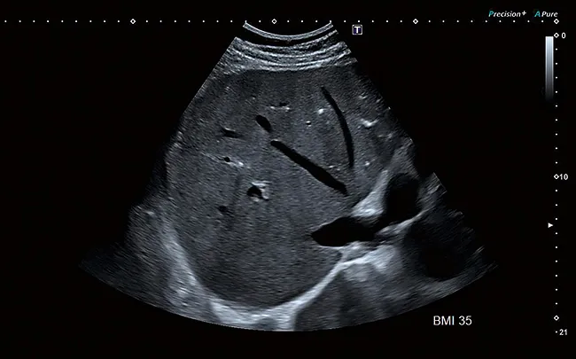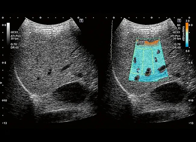 Визуализация с затуханием позволяет визуализировать и измерять коэффициент затухания жировой ткани печени. Усовершенствованные фильтры удаляют из результатов измерения такие структуры, как сосуды и кальцификации, что обеспечивает надежные результаты.