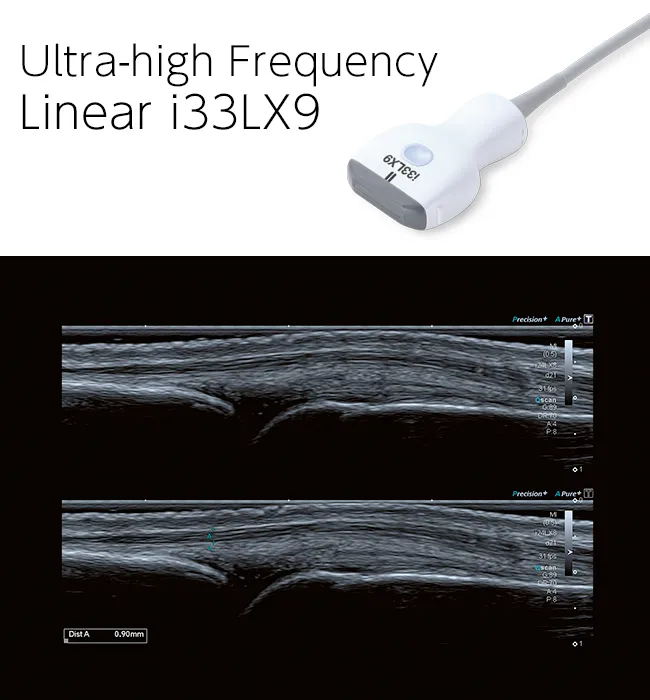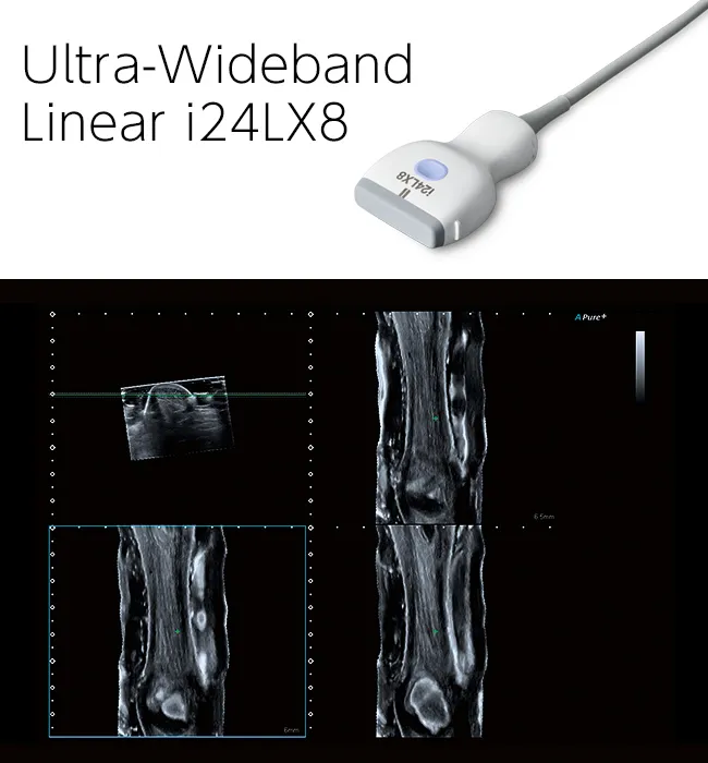 Стандартные и специализированные сверхширокополосные преобразователи с частотой до 33 МГц и интеллектуальной технологией динамического микропреобразования обеспечивают превосходную детализацию в ближнем поле для широкого спектра исследований.