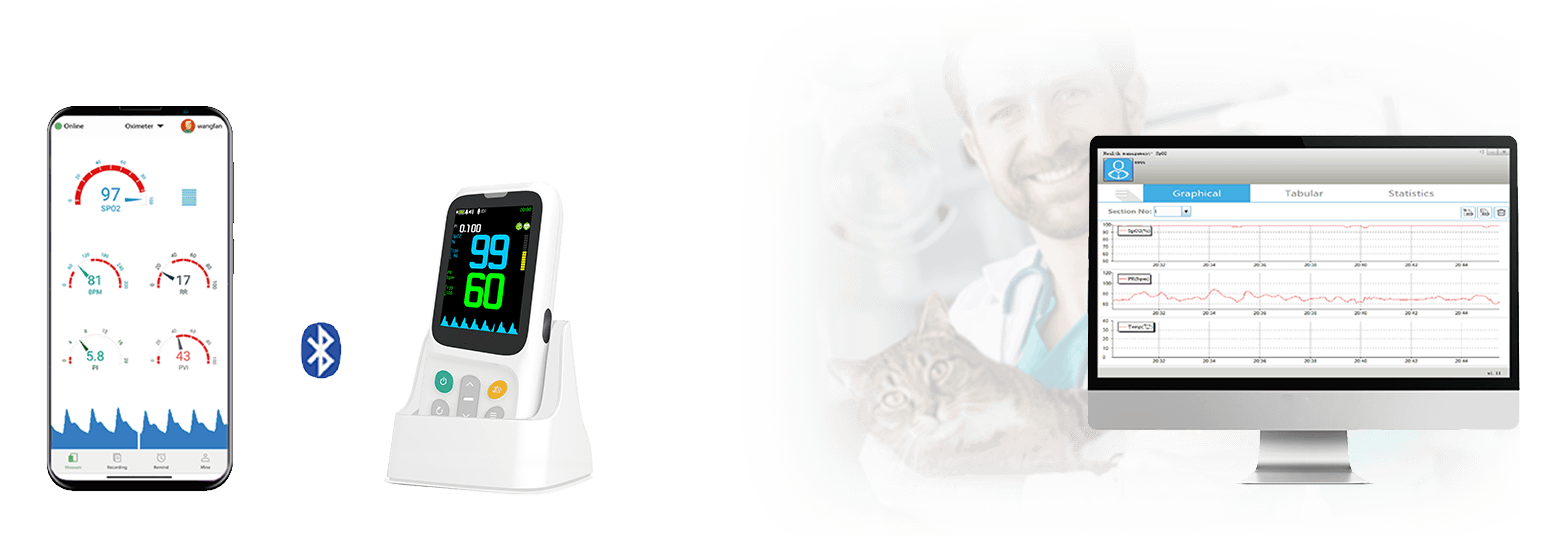 Ветеринарный пульсоксиметр VM-20 может подключаться к мобильному приложению через Bluetooth для обмена данными и управления ими.